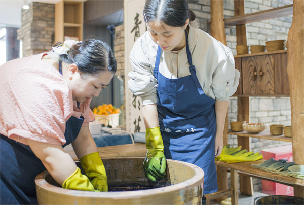 在文殊坊,一位来自广东的游客走进明月集参与非遗手工体验,一口气做了4条围巾,在植物染老师的带领下,她从图案设计开始学,自己完成了折叠、捆扎、染缸上色、晾晒等流程……在体验的过程中找到参与的乐趣。“我做了4条围巾,自己留一条,剩下的带回去送朋友,感觉很有意义,这可是我自己亲手做的礼物呢!”