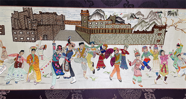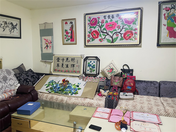 在杨德凤的羌绣工作间,她的羌绣作品挂满了墙壁,其中,她的作品《五十六个民族奔康梦》引人驻足,她将人物、植物与动物的图形,吉祥与祝福的花纹,通过扎绣、彩扎、彩挑、盘花等繁复的技法,绣入自织的布料之中,从山川草木到花卉瓜果,从飞禽走兽到古朴纹饰,构图古朴,栩栩如生,该作品早当地多处被展览,深受观众喜爱。“这幅作品有6米长,1米宽,里面有一百多个事物,包括五十六个民族的服饰、劳动场景等各个方面,这幅作品,我想表达出各民族团结奋斗共奔康幸福的场景”,杨德凤说到。