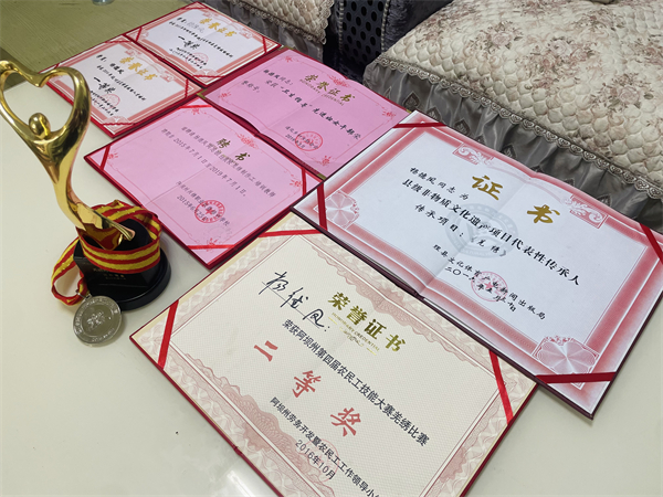 近年来,杨德凤凭借多方面的贡献,先后荣获阿坝州第四届农民工技能大赛羌绣比赛二等奖,2014年汶川县羌绣高技能人才培训一等奖等荣誉称号,并在2015年受邀担任阿坝州兴绣职业技能培训学校羌绣制作工培训教师三年。杨德凤表示,作为一名羌绣非遗传承人,深知自己的责任与义务。下一步,她将继续以羌绣传承发展为核心,以保护与创新相结合,不断发掘和丰富羌绣的产品种类和文化内涵,让更多的人接触羌绣、了解羌绣、学习羌绣,带动当地群众实现家门口就业、指尖上致富。(图由理县县委宣传部提供)