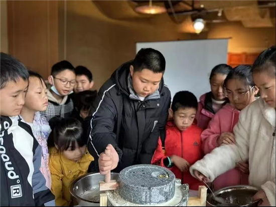 磨豆腐是古老的汉族手工技艺。活动开始之前,老师组织孩子们参与了“大豆的一生”知识课堂,听老师讲述关于大豆的知识,从大豆的生长周期到种植条件再到生产与传播,在欢乐的课堂氛围中收获知识。