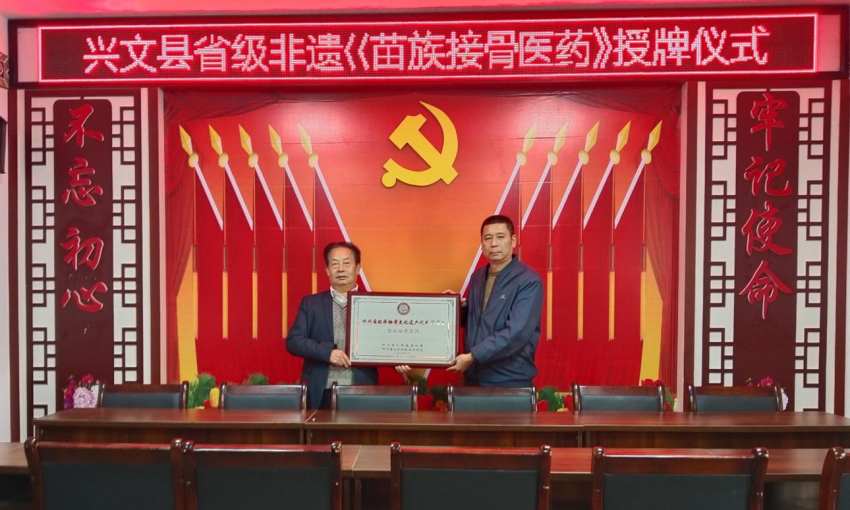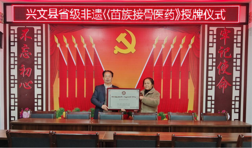 在授牌仪式上,兴文县苗族文化促进会会长李国文代表非遗保护单位——兴文县苗族文化促进会将非遗荣誉牌颁发给苗族接骨医药传承人黄国芳。黄国芳表示以后将刻苦钻研苗族接骨医药文化,掌握苗族接骨医疗技术本领,不断提高苗族接骨医疗水平,造福兴文各族群众。
