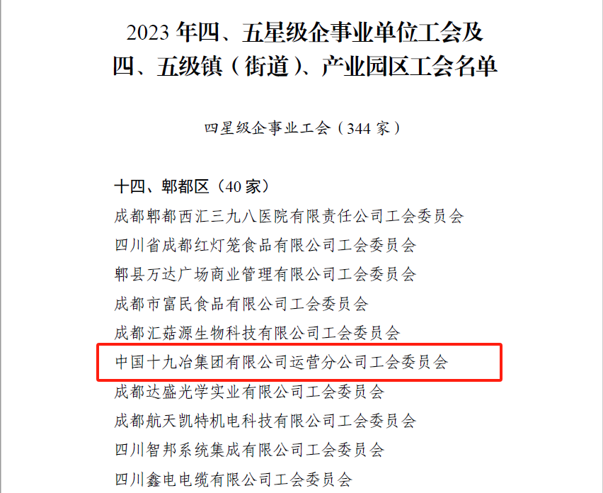中国十九冶投资运营公司工会获评成都市“四星级工会”