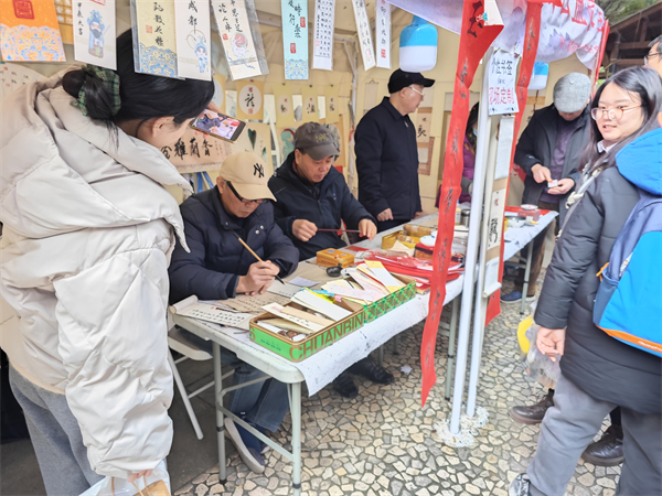 在老党员工作室的书法摊位前,现场定制的书法、印章、春联广受欢迎,老艺术家们坐在桌子前即兴创作的画面,也成了许多人到这里来的必打卡点之一,“这就是烟火气!”56岁的蓓蕾社区居民冯先生感慨道,“我们住在附近的居民比较爱来火烧堰凑热闹,碰上特色市集也来赶赶集,看一下现在的年轻人到底喜欢什么!”