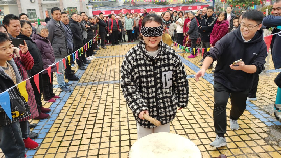 在村文化广场左侧,村民们正有序排起长龙积极参与“击鼓抱鸭”活动,蒙眼转三圈并直行击鼓者,便喜得肥鸭一只,活动十分火爆,现场嬉笑连连,再一转眼,是充满欢声笑语的“众志成城”活动,村民背对背运送气球到达目的地并在规定时间内挤破,便可赢得实用的家用礼品。