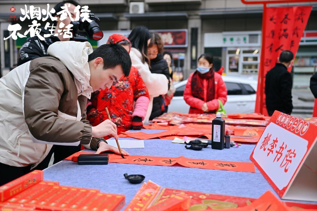 轻盈曼妙的国风舞蹈,风姿绰约的汉服巡游,唯美的夜景配合盛大的龙灯夜游,一场别开生面的龙年新春祈福嘉年华在成都武侯区音乐大道拉开帷幕。市民游客纷纷前来“祈福”,把新春祝福倾注于笔端,一笔一画写下代表着美好祝愿的“福”字。街边洋溢着浓浓年味与欢声笑语,琳琅满目的国潮文化、特色美食和金堂特色产品,生动还原了中国传统民俗文化活动和古代春节集市的消费场景。
