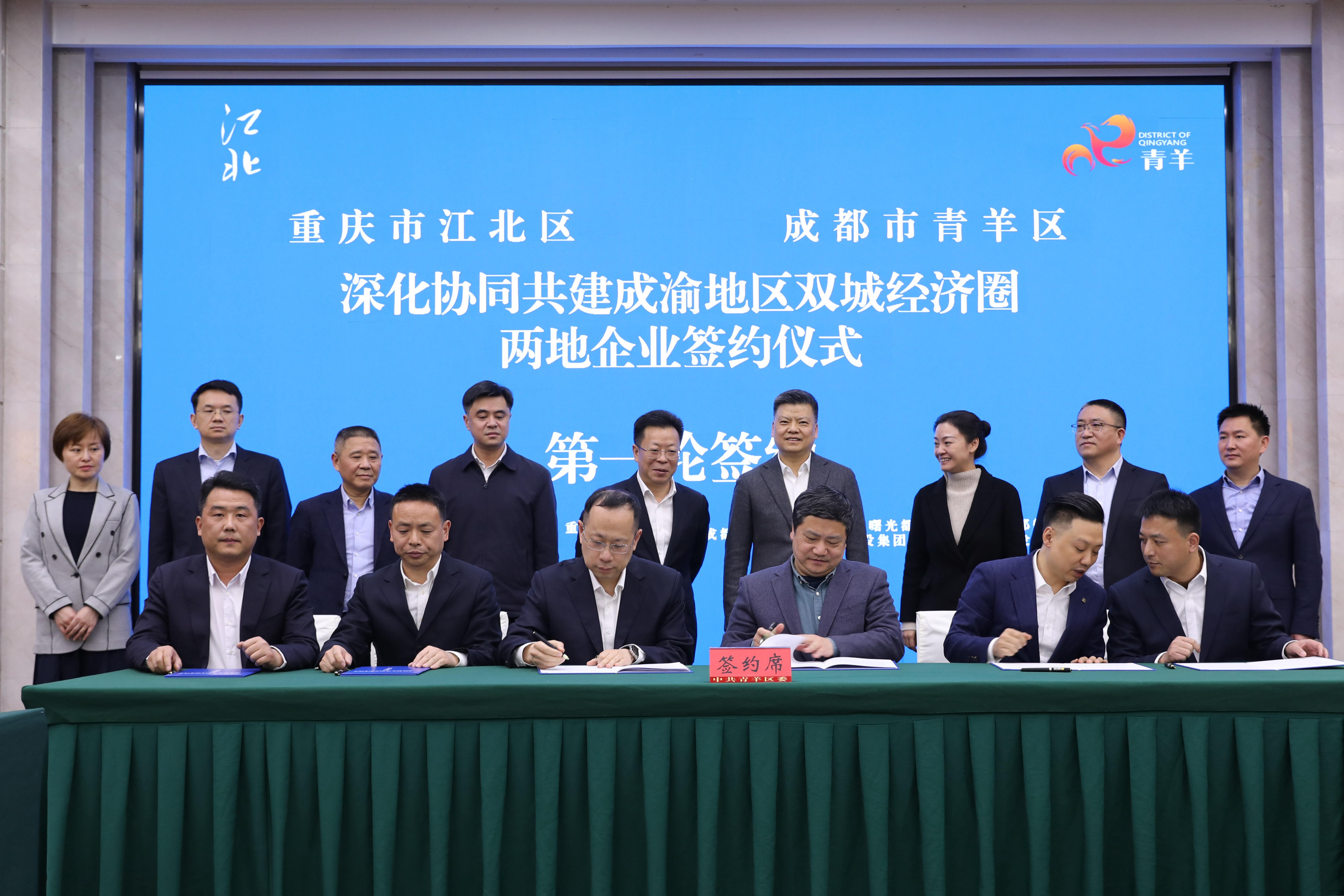 在江北区、青羊区深化协同共建成渝地区双城经济圈联席会议上,双方签署《重庆市江北区·成都市青羊区深化协同共建成渝地区双城经济圈2024年合作事项清单》,发布了培育“双城圈·友城行”典型实践案例、开展“江北青羊”文旅融合互促活动、打造观音桥—宽窄巷子文旅联动商圈、开展“重庆港城园区·青羊航空新城”企业交流合作等深化协同十件大事。重庆国家金融科技认证中心与成都银行股份有限公司、重庆曙光都市工业园建设集团有限公司与成都航空新城建设发展有限公司、重庆北仓文化产业集团有限公司与成都市星光华影视文化传媒有限公司等签订合作协议。
