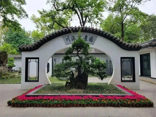 “川派盆景园”紧挨着北大门,由室外盆景展区和川派盆景资料馆、回廊、亭台等景观组成。这里把川派盆景的来龙去脉讲得清清楚楚、明明白白。