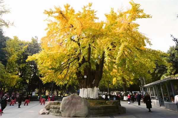 银杏广场上的这株唐代银杏树,枝干挺拔,形态优美,有“白果大仙”之称。它枝繁叶茂,主干得4人牵手才能相围,是夏天纳凉的好地方。这株唐代银杏是1986年从汶川县旋口白花乡“胜因寺”遗址迁入的;还有两株罗汉松系宋代栽植,由名山县观音堂移植而来。