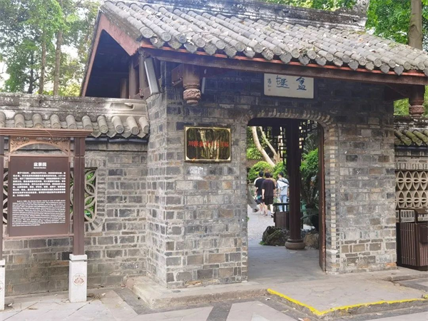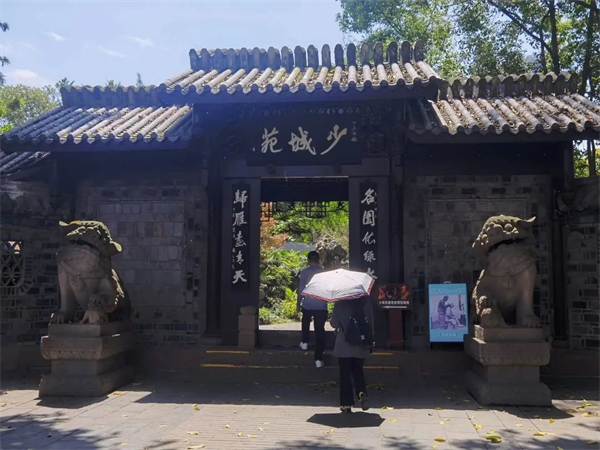 少城苑是公园内的一处露天茶社,小桥流水,绿树成荫,一把把遮阳伞下面是石头桌子加上竹制凳子,砖砌的围墙周边种有竹子,环境优美,是休闲品茶的好地方。
