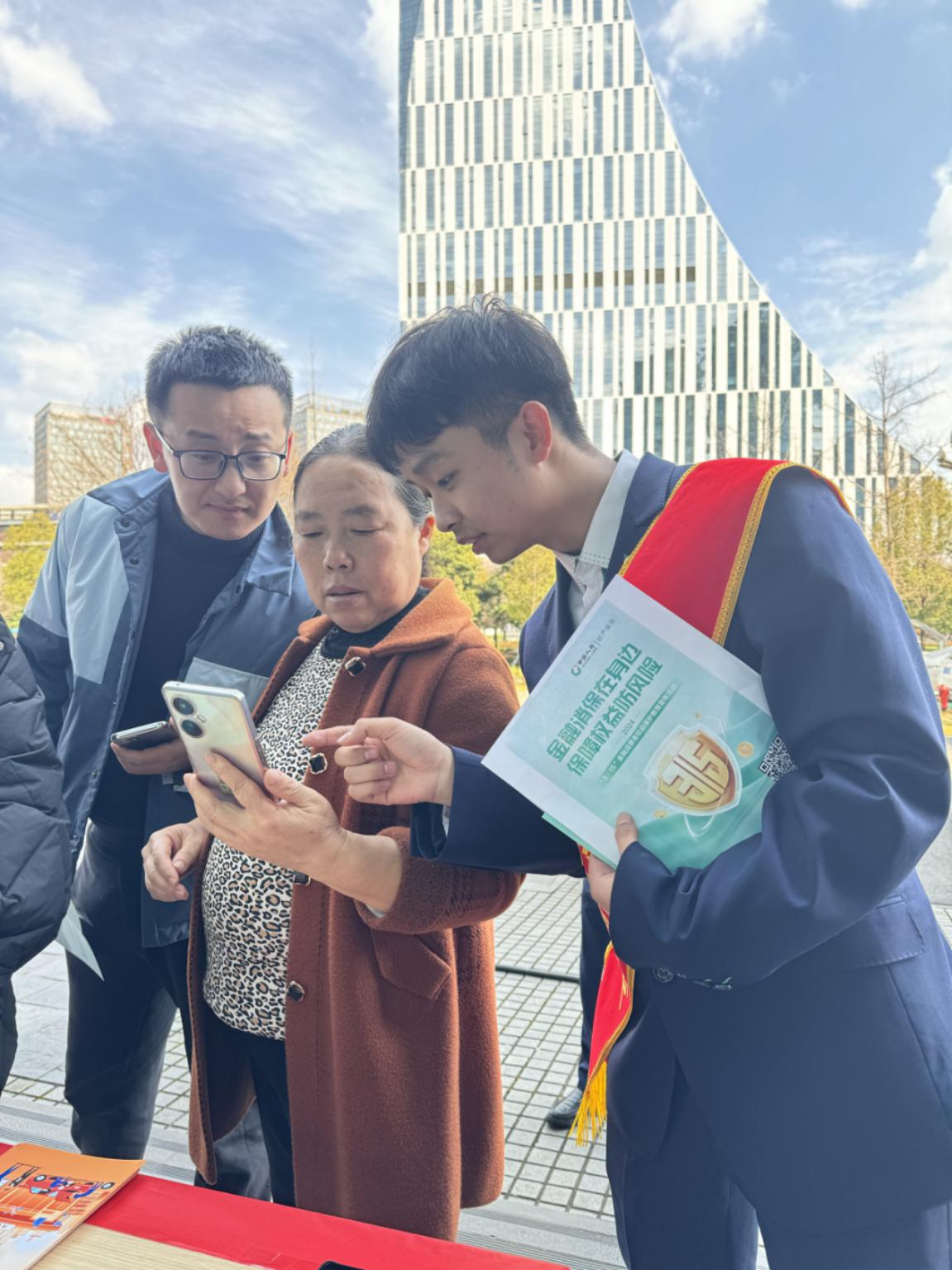 3月13日,中国人寿财险成都市中心支公司走进科技园区,为来往群众发放宣传折页,并引导参加“消保段位大挑战”线上互动活动。
