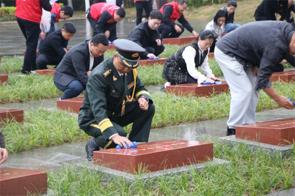 在烈士墓区,与会人员细心擦拭墓碑,清理墓区花木,表达对英烈的深切怀念与崇高敬意。大家深切感受到先烈英勇牺牲铸就幸福生活,表示将忠诚奉献,推进退役军人工作发展,共筑中国梦。