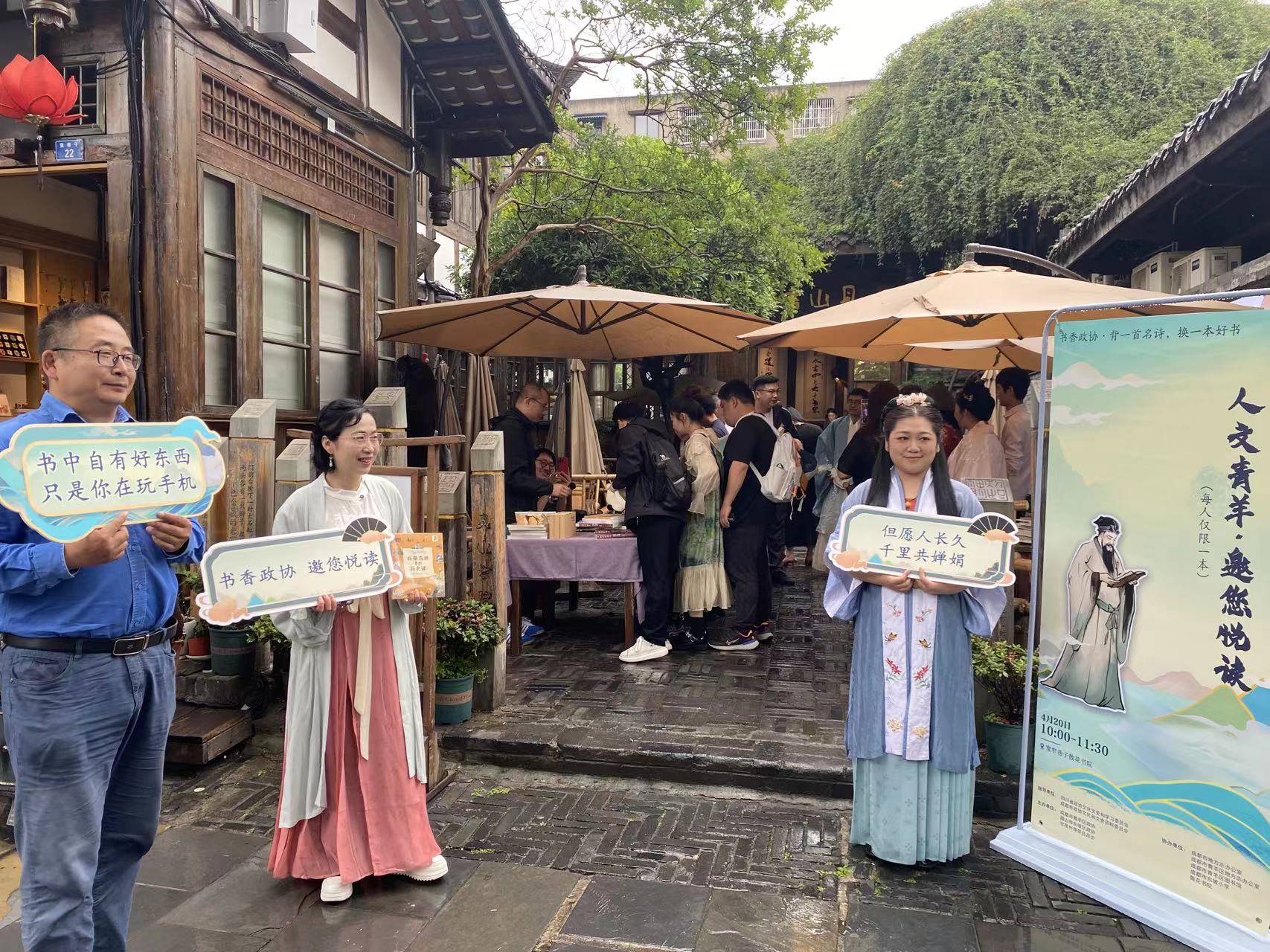“我们是青羊区政协悦读推广大使,欢迎大家来参加‘以诗换书’活动,只需任意背诵出一首诗歌就能获得一本您喜欢的书籍。”活动现场,青羊区政协多位悦读推广大使穿着古风十足的汉服,热情地向游客们推介,邀请大家参与。
