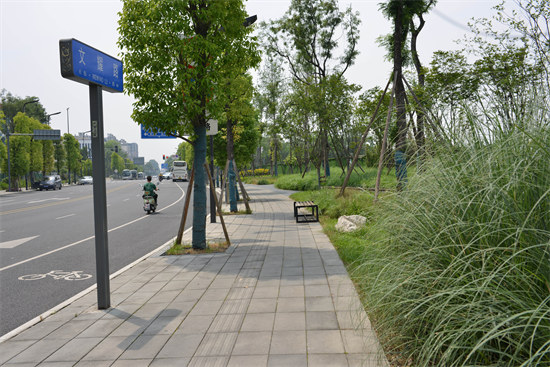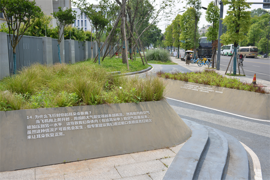 飞机元素的绿道、战斗机造型的石板、色彩造型丰富的花卉……走在文耀路上,一步一景皆是惊喜,突出一个“快速动感·简约时尚”。成都天府城市发展有限公司相关负责人介绍,整条道路打造贯穿成都公园城市理念,突出生态优先,让城市回归自然的主题,道路两侧各打造了10米宽的绿化带,以海绵城市的概念构建了下沉绿地、雨水花园,让道路在适应环境变化和应对自然灾害等方面具有良好的“弹性”,以便在雨水季节能吸水、蓄水、渗水、净水,并在需要时将蓄存的水“释放”加以利用,可用于景观灌溉,既美观又生态环保;道路两旁绿植种类丰富,栽种了香樟、矮蒲苇、紫穗狼尾草、芦苇、木春菊等几十余种四季常绿的草本花卉,四季皆是“繁花似锦”。