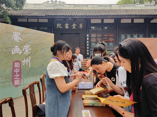 “陆游祠是为了纪念谁而建?”“天演博物馆的地址在哪里?”“华阳国志的作者是谁?”……杜甫草堂小广场前,设置了崇州罨画池博物馆打卡装置,现场观众现场可抽题,回答正确的观众可以获得罨画池博物馆门票。