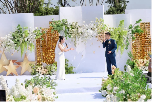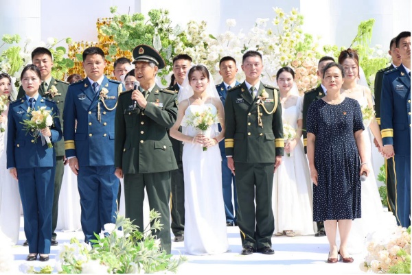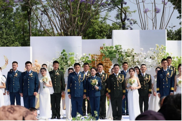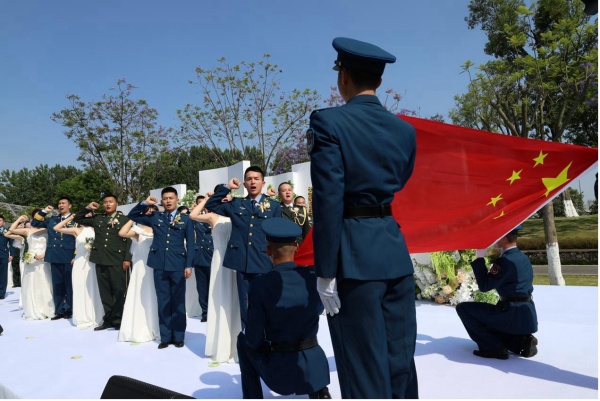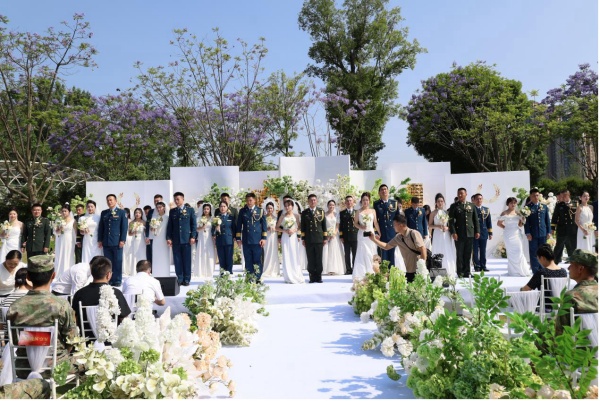 民政部社会事务司司长王金华,四川省民政厅党组成员、副厅长卢攀登,四川省退役军人事务厅二级巡视员李明,成都市民政局党组书记、局长王宏斌,成都市退役军人事务局党组成员、副局长孙振中等领导出席活动,为来自驻蓉部队的26对军婚新人送上最诚挚的祝福。在庄重的婚礼仪式上,出席活动的军地领导为新人们颁发结婚证书,与在场的新人亲属、战友、市民朋友共同见证新人携手步入婚姻殿堂。活动现场,新人们面向国旗庄严宣誓,表达了对党和国家的忠诚以及对婚姻的忠贞不渝。
