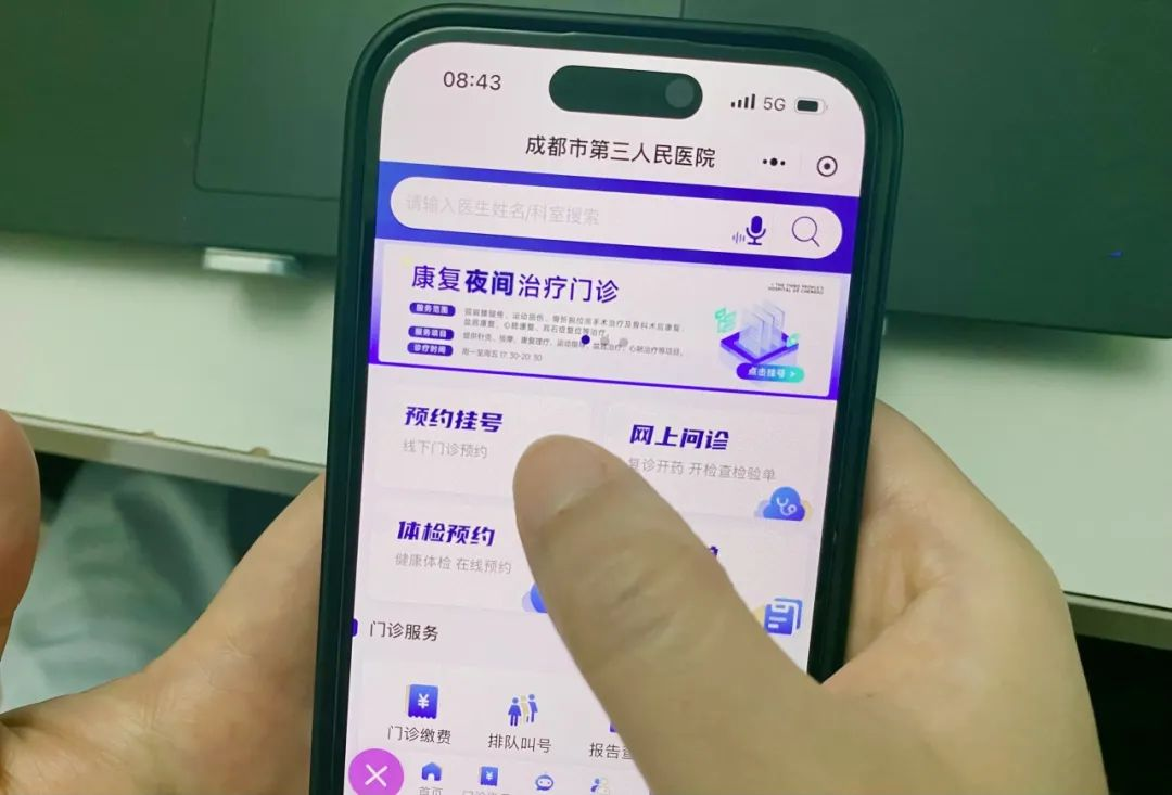 四川新闻网-首屏新闻成都5月28日讯 智能时代,不用入院就能感受便捷就医?用手机点开成都市第三人民医院的微信公众号,左下角的“掌上医院”,预约挂号、网上问诊、体检预约、自助开单等内容便跃入眼帘,原本需要到医院才能搞定的事情,在手机上就能轻松办理。