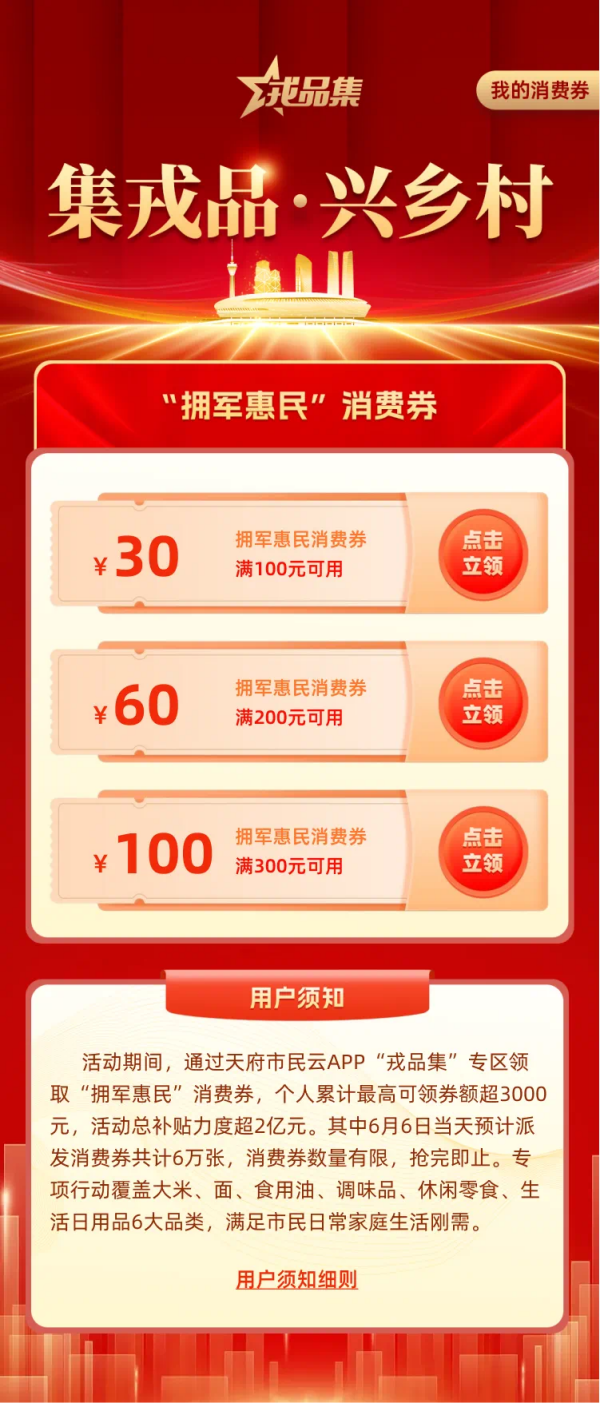 四川新闻网-首屏新闻成都6月5日讯 “拥军惠民”消费券来了!福利满满!成都市退役军人就业创业,公共品牌“戎品集”发布会暨“拥军惠民专项行动”启动仪式将于6月6日(星期四)14:30在成都新华宾馆举行。活动期间将发放总计2亿元的“拥军惠民”消费券欢迎广大市民定好闹钟前来抢券!!
