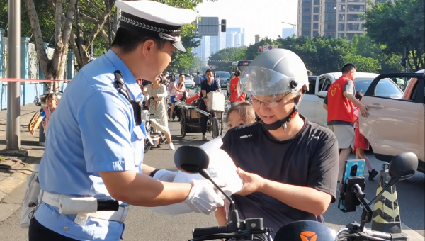 “请戴好安全头盔再骑乘电动自行车哦!”民警拦下了一辆家长与孩子都未佩戴头盔的电动自行车,执勤民警耐心劝导着学生家长,讲解不佩戴安全头盔的危害,并送上《成都市非机动车管理条例》宣传资料,提醒家长及学生“道路交通事故猛于虎”要自觉遵守交通法规,守法安全出行,养成骑行佩戴安全头盔的良好习惯。