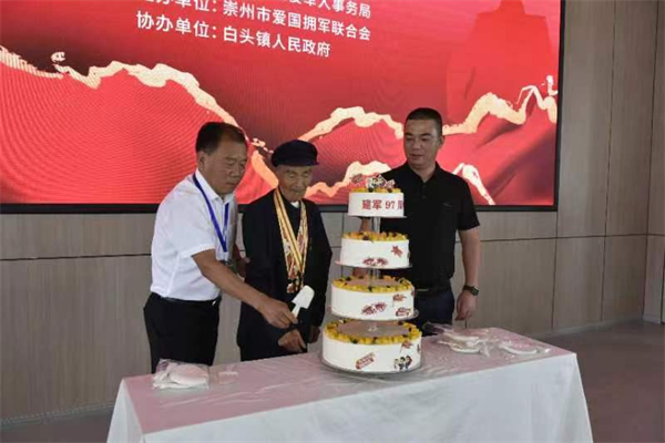 启动仪式上,工作人员邀请老兵上台切生日蛋糕,并向现场的老兵们赠送了慰问品,对新加入崇州市爱国拥军联合会的11个企业(单位)授牌。
