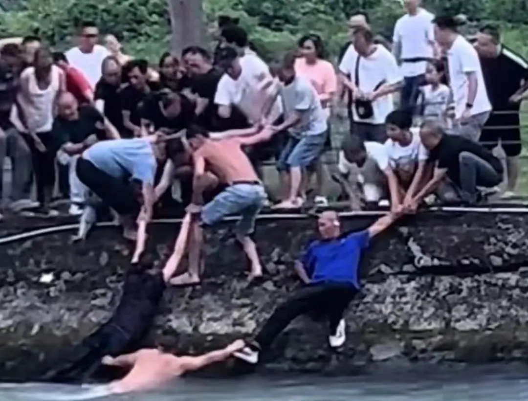 堤岸陡立湿滑,三人无法顺利上岸,岸上群众用自己的身体搭成“人链”进行救援,在众人齐心协力下,落水者被营救上岸。