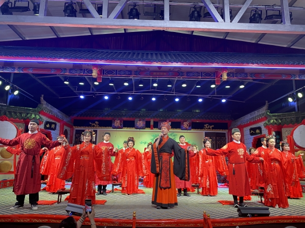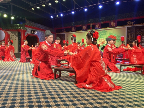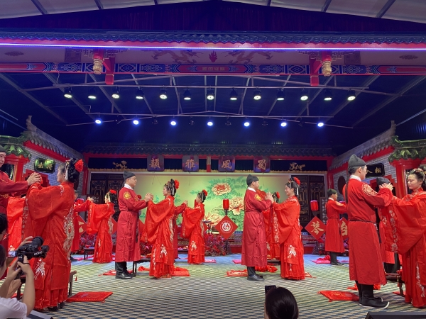 在集体婚礼现场,身着华丽汉服的十对新人缓步登台。随后举行了同牢(同牢而食以示共同生活之开始)、合卺(合卺而饮同甘共苦比翼齐肩)、结发(结发成仪,夫妇百年)、执手礼成(执子之手,与子偕老)等仪式。圆满礼成后,新人们齐聚合影,留下对未来美好幸福生活的祝愿。