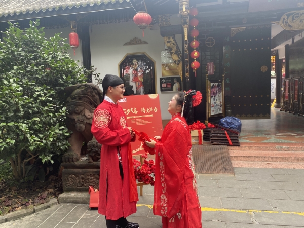 四川新闻网-首屏新闻成都8月11日讯 8月10日,是中国传统节日——七夕节。十对新人身着传统华服、凤冠霞帔,在红墙黛瓦的琴台古径,共同参加由青羊区民政局主办的“七夕有喜 情定琴台”新时代中式集体婚礼。在现场司礼的带领下,新人们用一场饱含千年中华文化韵律的集体婚礼,许下相守一生的誓言。