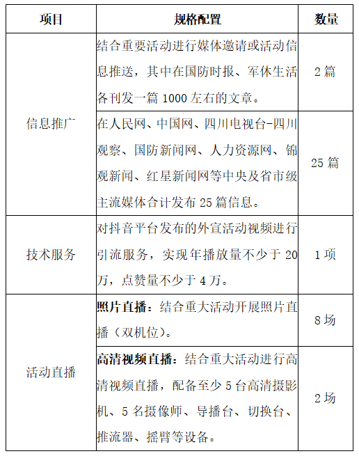 三、采购内容:成都市军休中心外宣活动照片直播、高清视频直播、信息推广及技术推广服务。