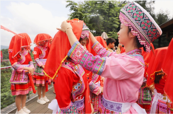 为巩固民族团结进步示范成果,2024年5月20日,仙峰苗族乡开展了一场别开生面的苗族集体婚礼体验活动。当天下午2点,米自各民族的52对“新人”身着苗族盛装步入仪式现场。美丽新娘穿着苗族传统婚服,手拿红伞,衣袂与头顶的珠帘随着走动悠悠晃动,身着粉衣的伴娘为全体新娘盖上红头巾。苗族长老按苗族传统婚俗,主持出嫁仪式。