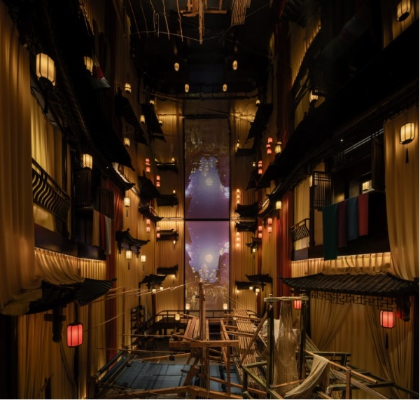 往下走,就像一个虚设的剧场,灯笼四起,黄昏满月,游人或凭栏而立,或倚窗相望,听机杼之声,别有一番“贝锦斐成,濯色江波”的梦幻之境。