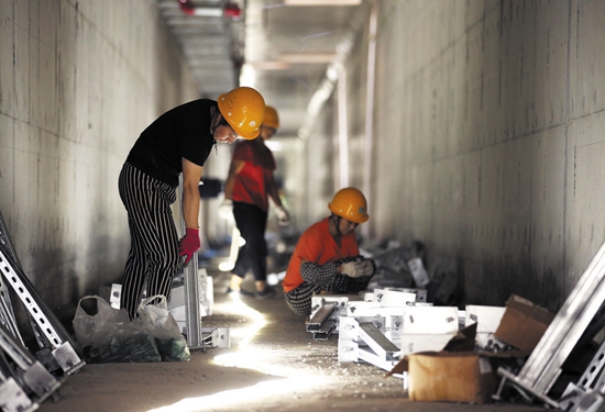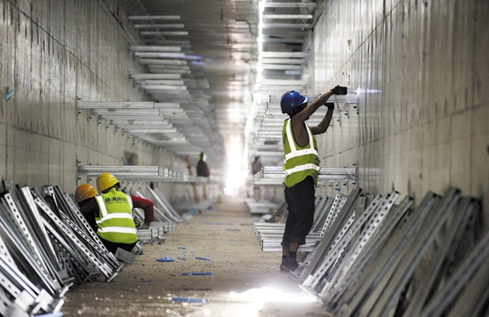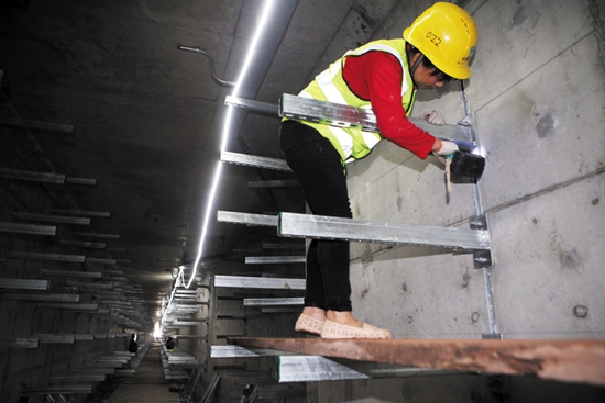 施工人员在机场北一线综合管廊的高压输电舱内安装线缆托架