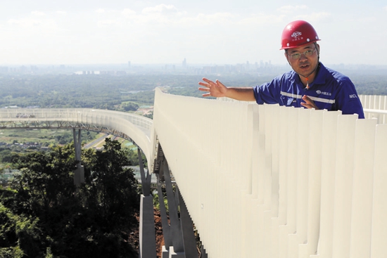 据高空栈道项目总工程师王文斌介绍,由246根桩基础托起的2.81公里栈道距离地面最高处23米,相当于7层楼高。因为是依山凌空架设,高空栈道多处为异形结构,尤其是转弯和坡道,作为主要构件的钢桁架全部都是定制尺寸,误差不超过2毫米。
