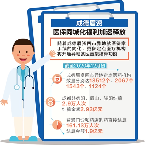 把参保群众关心感受度最高的经办窗口服务作为切入点,成都还进一步简化手续、便捷服务,率先取消对德阳、眉山、资阳三市异地就医提前备案手续,同时持续扩大异地就医覆盖规模。市医保局相关负责人介绍,截至2020年12月初,成德眉资四市异地定点医药机构数量分别达13512个、2067个、1543个、1124个,成都赴德阳、眉山、资阳结算2.9万人次、结算金额2.93亿元,普通门诊和药店购药直接结算161.13万人次、结算金额1.9亿元。“此举可从源头化解市民报销周期长、垫付资金负担重、往返奔波费用大等难题,带给市民最直接的便捷,最实在的获得感与幸福感。”