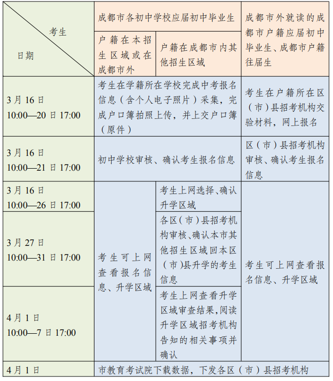 成都全市所有初中学校(含市直属<直管>以及区属公办、民办学校)均按属地化原则,由属地(校址)所在区(市)县负责组织报名以及各项考试(包括体考、实验操作考试、道德与法治会考、历史会考、中考考试,下同)。学籍、户籍都在成都市的应届毕业生,均在学籍所在学校报名并参加各项考试。学籍在成都市、户籍不在成都市的应届初中毕业生,原则上应回户籍地报名参加中考。在成都市外就读、需要回成都市升入高中阶段教育学校的成都市户籍应届初中毕业生,在户籍所在区(市)县招考机构报名,并参加各项考试。户籍在成都市的往届生在户籍所在区(市)县招考机构报名,并参加各项考试。