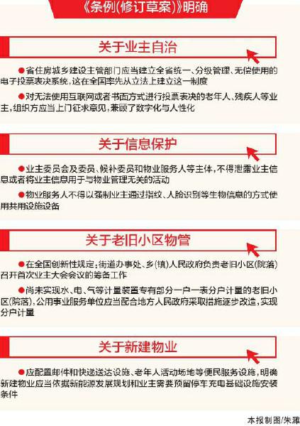 推动老旧小区物业管理等民生工程也备受关注。《条例(修订草案)》在附则中明确街道办事处、乡(镇)人民政府组织和推动老旧小区(院落)建立物业管理机制,在全国创新性规定:街道办事处、乡(镇)人民政府负责老旧小区(院落)召开首次业主大会会议的筹备工作。尚未实现水、电、气等计量装置专有部分一户一表分户计量的老旧小区(院落),公用事业服务单位应当配合地方人民政府采取措施逐步改造,实现分户计量。《条例(修订草案)》还立足民生保障,满足人民群众美好生活需要,明确了新建物业应配置邮件和快递送达设施、老年人活动场地等便民服务设施,明确新建物业应当依据新能源发展规划和业主需要预留停车充电基础设施安装条件。