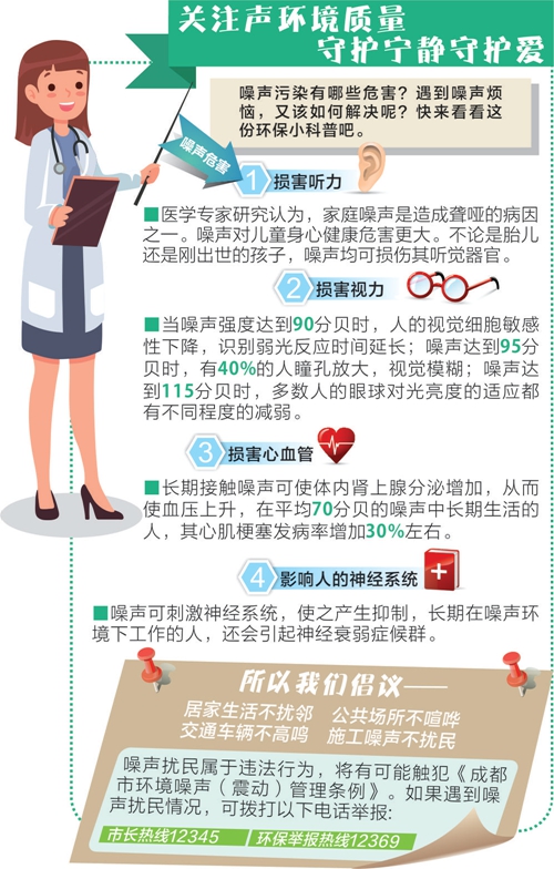 小区旁的工地老是深夜施工,各种噪声吵得人睡不着;楼上邻居总是深夜练琴,怎么办;隔壁那个工厂一天到晚机器都发出嗡嗡嗡的声音,听得人心烦意乱……生活中您是否会遇见这些烦恼呢?良好的声环境质量对人体健康至关重要,如今,越来越多的人追求一个宁静和谐的生活环境。针对噪声扰民问题,成都做了哪些工作?还将采取什么措施呢?记者昨日从市生态环境局获悉,成都今年将安装声环境质量自动监测设备,初步建立成都市声环境质量自动监测网络,加大对社会生活噪声的监管。