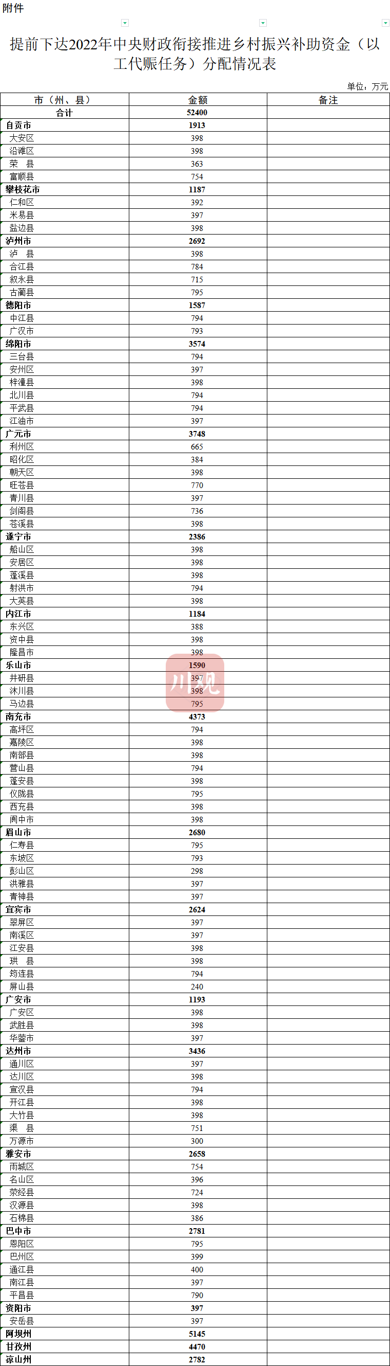 据悉,2022年中央财政衔接推进乡村振兴补助资金(以工代赈任务)金额为52400万元,将用于支持巩固拓展脱贫攻坚成果、衔接推进乡村振兴等方面。从资金分配数额来看,阿坝州、甘孜州、南充市、广元市、绵阳市排前五。