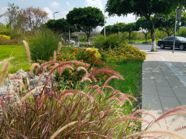 成飞大道绿道全长2.3公里,犹如翡翠丝带串联日月大道与保密广场。绿化带繁花似锦,紫薇、海棠等季节性花卉竞相绽放,灌木点缀其间,色彩缤纷。