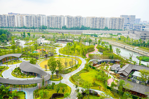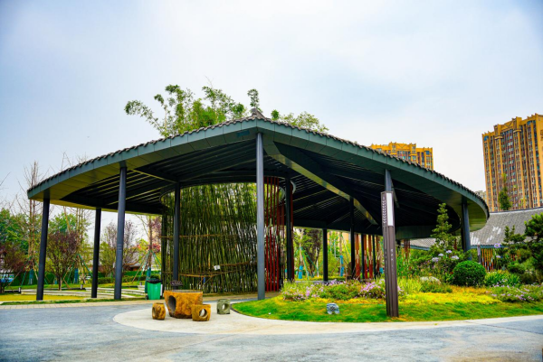 公园内,水波纹廊架轻舞飘逸,特色景墙诉说古韵,曲形廊架勾勒风情,农耕雕塑凝固时光。它们巧妙融入清水河文化及川味本源、稻作农耕的主题,让川西文化在此绽放光彩,营造出一派浓厚的文化氛围。
