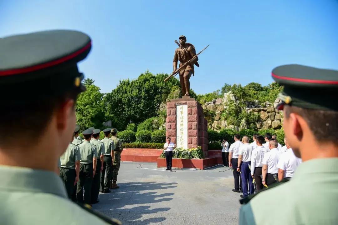 成都高新区爱国拥军联合会解放军驻蓉某部联合主办“勿忘国耻 铭记历史中国人民抗日战争胜利纪念日向川军抗日阵亡将士纪念碑敬献花篮仪式”。联合会秘书长介绍了川军在抗日战争中的伟大功绩和纪念碑相关情况,参战老兵何生富讲述战斗故事,警醒人们铭记历史、奋发图强。全体人员依次瞻仰纪念碑并献上鲜花追思革命先烈。