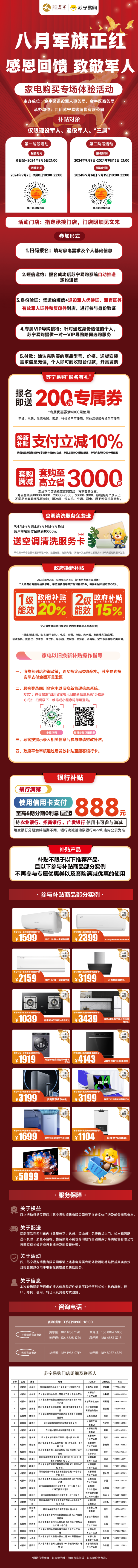 2024年9月7日至2024年9月8日、2024年9月14日至2024年9月15日期间,现役军人、退役军人及“三属”通过扫码提前报名的方式参与苏宁易购家电购买专场活动,可享受报名有礼、清洗服务免费送、政府换新补贴、银行补贴等优惠权益,具体购家电活动事宜详见下方“专属活动长图”。