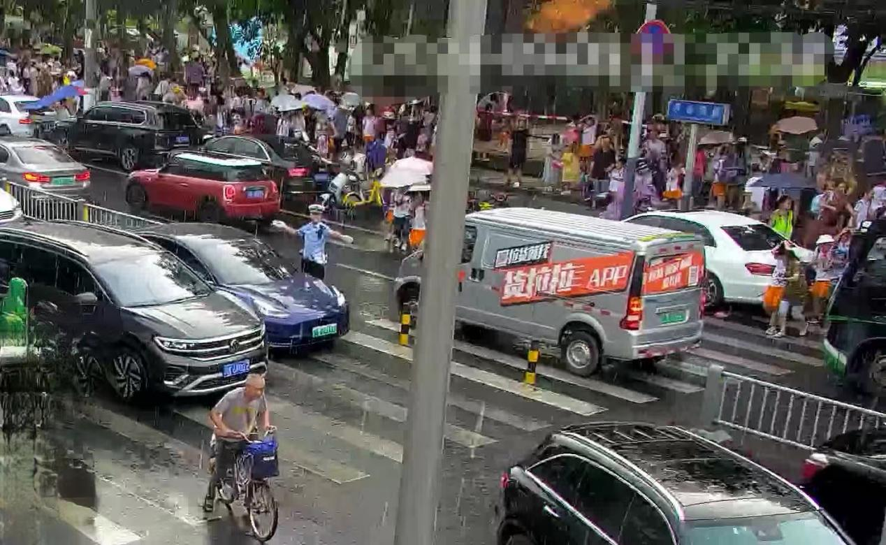 “请大家不要着急,不要在车辆中穿行,走人行道,注意安全……”“车辆先不慌,大家排起,不要堵起……”王前站在大雨中,吹着警哨、挥舞着手臂,示意行人靠边行走。他全然不顾雨点犹如断线的珠子敲打帽檐,瞬间浸湿了全身,在大雨中坚守岗位,忘我而投入的指挥交通,只为让路面交通变得有序,学生的放学路更加安全、畅通。一位带着学生的老人要把手中雨伞送给王前,他谢绝老人的好意后,周边的车辆、行人似是回应王前的坚守,更有秩序在道路上通行。