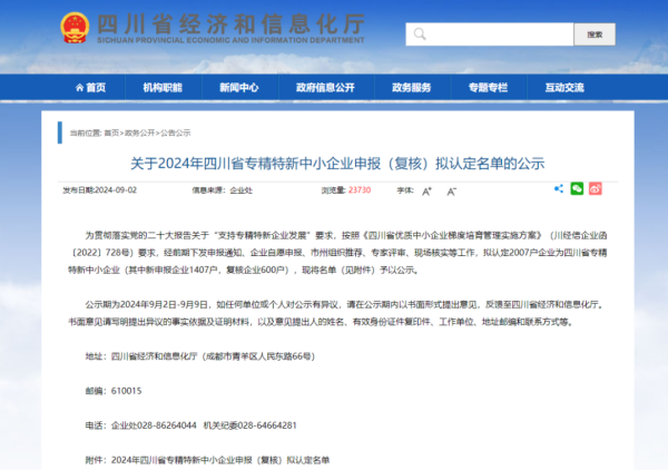 近日,四川省经济和信息化厅先后发布了《关于四川省新申报第六批专精特新“小巨人”企业和第三批专精特新“小巨人”企业复核通过名单的公示》以及《关于2024年四川省专精特新中小企业申报(复核)拟认定名单的公示》。在两个名单中,据不完全统计,共有30多家园区企业上榜。
