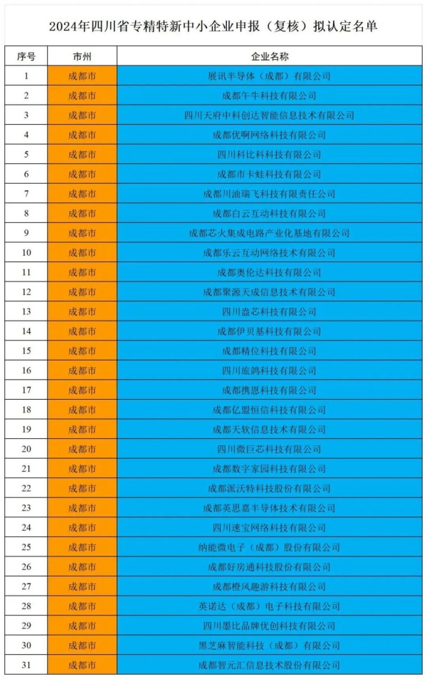 展讯半导体(成都)有限公司、成都午牛科技有限公司、四川天府中科创达智能信息技术有限公司等31家企业进入名单。