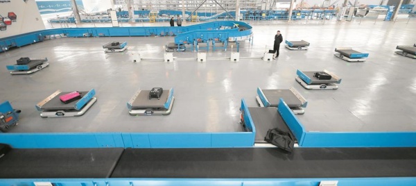 传送带快速旋转,一个个行李箱飞快从眼前掠过;AMR(自主移动机器人)小车灵活避开障碍物,将行李箱运到目的地……在公司的测试中心,上万平方米的空间动感十足,正在测试的全是公司最新研发的前沿技术产品。