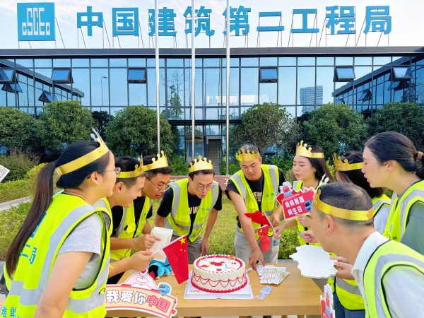 “我和我的祖国,一刻也不能分割……”国庆节来临之际,9月30日,中建二局四川分公司举办“我与祖国同庆生”系列活动,走进位于成都天府新区的四川省重点工程四川名人馆建设项目现场,10余名国庆期间过生日的一线建设者手持小国旗,唱红歌、吃蛋糕,共同为祖国送祝福。