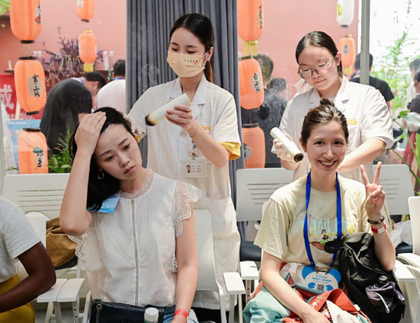 “这盆植物是金钱草,有解毒消肿的作用”“这盆栽种的是麦冬,可以泡水喝,有润肺养阴的作用”……在医馆的中药百草园,留学生们近距离感受中药本草最初的样子,了解中草药的功效。留学生们还亲手体验中药香囊、中药团扇、非遗漆扇、艾条等制作,感受中医文创的趣味,品尝药食同源产品、茶饮,赞叹中医药文化的神奇魅力。