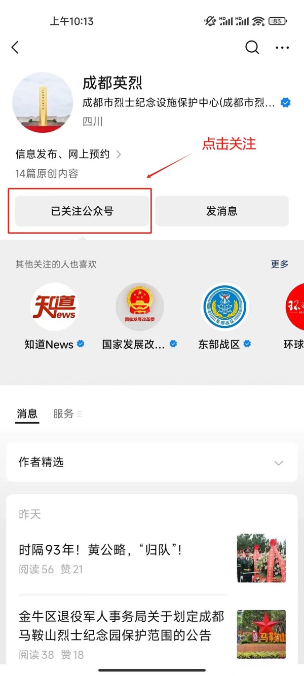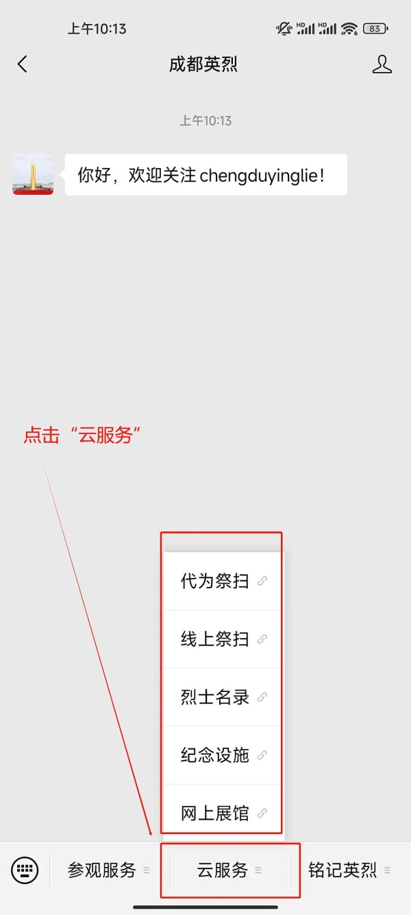 微信搜索“成都英烈”微信公众号→点击关注→点击“云服务”。