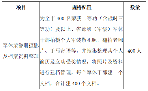三、采购内容:为全市400名荣获二等功(含战时三等功)及以上、省部级(军级)军休干部拍摄个人军装敬礼照,翻拍老照片、手写寄语等,并搜集整理其个人简历及立功受奖情况,将照片及资料进行建档管理,每个军休干部建一个文档,合计建400个文档。