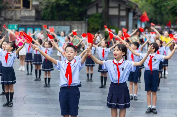 宽窄巷子联合成都市泡桐树小学联合策划了“我为祖国献首歌”快闪,当耳熟能详的音乐响起,少年们用饱含深情的歌声唱响宽窄。