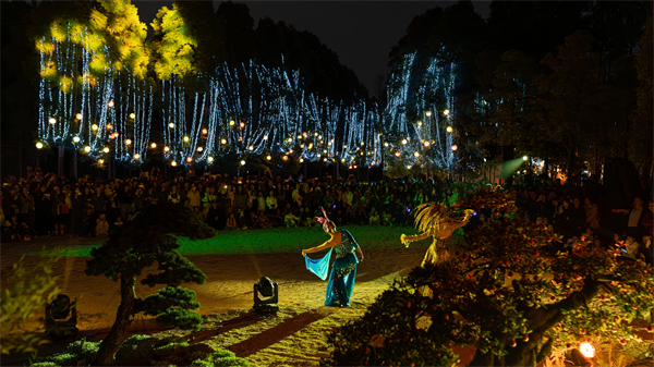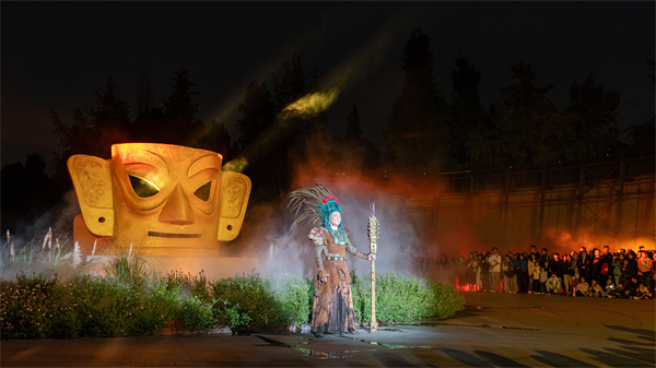 “我是一位通晓过去、预知未来的古蜀先民,今天将由我带领大家走进神秘的古蜀王国……”国庆期间,当夜幕降临,古老的金沙遗址上响起了来自远古的呼唤。只见在以金沙遗址出土的大金面具为造型的雕塑旁,一位“古蜀先民”穿越时空而来,将现场的观众带回了三千多年前神秘的金沙王国。气势恢宏的古蜀礼乐中,光柱刺破黑暗,“古蜀人”跳起圣舞……这是金沙遗址博物馆推出的大型跨界文旅活动“夜游金沙·穿越古蜀——博物馆情景式导览演出秀”。